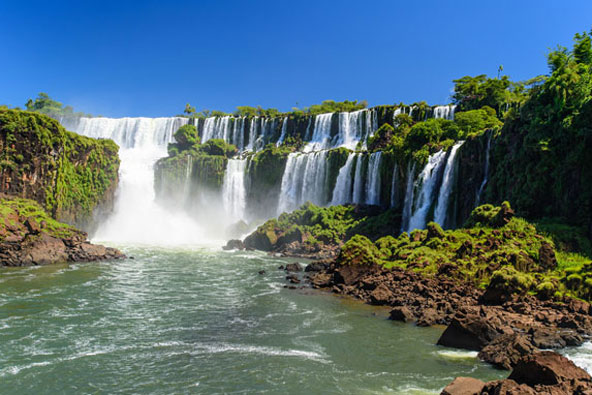 מפלי האיגואסו מפלי האיגואסו (Cataratas do Iguaçu) הם סדרה של מפלי מים אדירים על נהר האיגואסו, השוכנים על הגבול בין ברזיל לארגנטינה. יש כאן 275 מפלים, אשר נופלים בשתי מדרגות וספיקתם עולה על 6.25 מיליון קוב בשעה, מה שיכול להסביר את פירוש השם איגואסו – מים גדולים. אמנם, מרבית שטחם של המפלים (שמונים אחוז) נמצא בארגנטינה, ובצד הארגנטינאי ניתן לטייל בין המפלים, אבל התצפית הפנורמית על המפלים אפשרית רק מברזיל. המפל המפורסם מכולם הוא מפל "גרון השטן" השוכן על הגבול בין שתי המדינות ולו צורת פרסה. מסביב למפלים יש פארק לאומי עצום עם ג'ונגל שבו חיים בעלי חיים רבים ובהם יגוארים, קופי קפוצ'ין, טפירים ועוד, וכן מינים רבים של ציפורים. במפלים ובקרבתם יש אטרקציות רבות לתיירים, כמו סכר איטייפו המשותף לברזיל ולפרגוואי ושוכן על נהר הפרנה, הסכר ההידרו-אלקטרי השני בגודלו בעולם. כדאי לבקר גם בפארק הציפורים שבו מינים רבים של ציפורים, חלקן בסכנת הכחדה. בנוסף, ניתן לעסוק באזור המפלים בשלל פעילויות מרגשות – שייט בסירת מנוע בין המפלים, טיסה בהליקופטר, צניחה חופשית ועוד. מפלי האיגואסו. התצפית היפה ביותר היא על המפלים היא מהצד הברזלאי