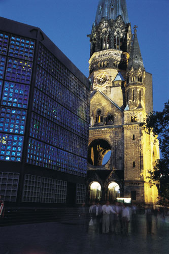 | הכנסייה לזכר הקייזר וילהלם בברייטשאיידפלאץ, ליד רחוב קורפירסטנדאם (קוּ'דאם), 1998. גרמניה המערבית סיבסדה את רלין בסכומי עתק, להצגת חלון ראווה נוצץ בפני הגרמנים שמעבר לגבול |