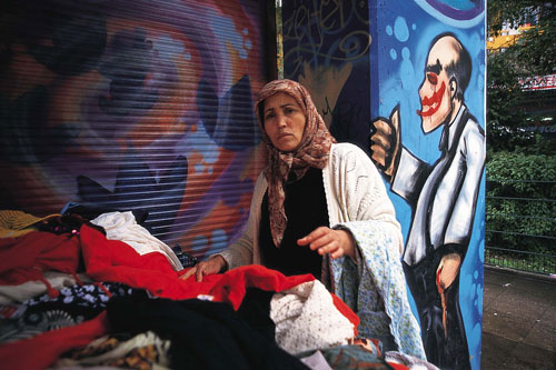 | קרויצברג, הרובע התורכי. בין דוכני הדונאר והבקלאווה וכתובות הגרפיטי של תנועת השחרור הכורדית, הסתובבו גם ניאו-נאצים, רדיקלים שמאליים וקומוניסטים כורדים |