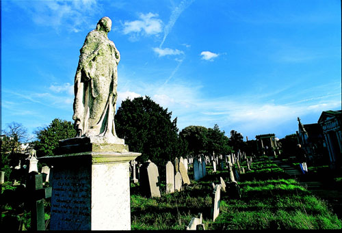 על גופן ועל בגדיהן התחתוניים וחשפו אותן במקומות ציבוריים. הן קראו סיסמאות ברגעים הדרמטיים ביותר, באולמות תיאטרון ואופרה. הן היו מוכנות להיאסר, ובכלא היו פוקקות את פיהן כדי שלא יוכלו להאכיל אותן. בשלב מאוחר יותר עברו ליידוי אבנים וגרמו נזק עצום לרכוש, אם כי נזהרו שלא לפגוע בבני אדם. פנקהרסט עצמה נכלאה שמונה פעמים, ובימים שלא היתה בכלא התרוצצה ברחבי אנגליה וגם בארצות־הברית ובקנדה, ונשאה דברים נלהבים באוזני כל מי שרצה לשמוע. המשטרה התייחסה אל הסופרז'יסטיות כאל פורעות חוק, וכפי שזה קורה לעיתים קרובות, העובדה שהיו משכילות ובנות תרבות גרמה לשוטרים ולבריונים מזדמנים להיות יותר אלימים כלפיהן. מלחמת העולם הראשונה קטעה את מלחמת הקודש של הסופרז'יסטיות, ובשנת 1918 העניקו באנגליה זכות בחירה לנשים (מעל גיל 30). שנה מאוחר יותר ניתנה להן גם הזכות להיבחר לפרלמנט. פנקהרסט ניסתה לחזור לעסקים ופתחה בית־תה בריוויירה הצרפתית ונכשלה שוב. בשנת 1928 מתה אמלין פנקהרסט ונקברה כאן, ושנתיים מאוחר יותר התאספו שוטרים רבים ליד קברה; הפעם לא כדי להכות. היתה זו תזמורת המשטרה שבאה לנגן את הימנון הנשים. פנקהרסט כבר היתה לגיבורה רשמית. בשביל המקביל משמאל נמצא קברו של הרופא ד"ר ג'ון סנו (Snow), שנקבר כאן ב־1858. הרבה סיפורים קשורים בשמו של האיש הזה, שהיה הראשון שהשתמש בכלורופורם להרדמת מנותחים. הוא אפילו הרדים את המלכה ויקטוריה כאשר ילדה את שני ילדיה האחרונים. ברחוב ברודוויק (Broadwick St.) שבסוהו, במרכז לונדון, יש פאב שנושא את שמו של הדוקטור. ליד הפאב אפשר לראות משאבת מים, שעומדת לזכר המשאבה המקורית שניצבה כאן בראשית המאה ה־19. בשנת 1832, בעת מגיפת הכולירה, פירק ד"ר סנו את הידית של המשאבה, כדי למנוע את התפשטות המחלה דרך המים. ג'ון ויטיץ', צייד רוחות לונדוני, טוען כי רוחה של המשאבה הנכה היתה פוקדת מאז את הפאב ומבהילה את יושביו. 160 שנה לאחר האירוע הטראומטי, בשנת 1992, הוצבה שם משאבה שלמה עם ידית, ומאז לא ראה איש את הרוח. קברו של ג'ון קונסטבל בהמסטד שכונת המסטד הצפונית, שהתפרסמה בעבר בזכות מי המרפא שנבעו מן הבאר שלה, היא היום אחת משכונות המגורים האטרקטיביות ביותר בלונדון. המבנה הטופוגרפי הגִבְעי הכתיב אדריכלות יוצאת דופן, השונה מהבנייה הסטנדרטית בעיר. רחוב צ'רץ' רו (Church Row) הקטן נחשב בעיני רבים לאחד הרחובות המושלמים ביותר שנשארו בלונדון מהתקופה הג'ורג'יאנית. במרכזו נמצאת כנסיית סנט ג'ון, וחצר קבורה קטנה צמודה אליה (ונא לא להתבלבל עם בית הקברות של המסטד).  | | ברומפטון. עוד מפורסם שקבור כאן הוא ד"ר ג'ון סנו, הרופא הראשון שהשתמש בכלורופורם להרדמת מנותחים. הוא אפילו הרדים את המלכה ויקטוריה כאשר ילדה את שני ילדיה האחרונים |