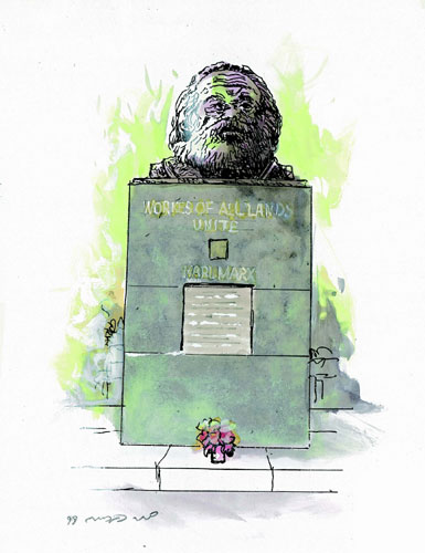 "הרבה דברים חשובים גיליתי בחיי כמדען, אבל התגלית החשובה ביותר שלי היא פאראדי"). פאראדי גילה את תכונותיו של השדה המגנטי ויצר את הדינמו הראשון, וכך הפך את החשמל – שהיה עד אז שעשוע של קוסמים – לכוח המניע של התעשייה והייצור. אחד האחרונים שנקברו פה הוא ג'ייקוב ברונובסקי, יהודי פולני שהגיע לאנגליה בשנת 1920, למד באוניברסיטת קיימברידג' ועד גיל 50 עסק במתימטיקה ובכלכלה. ואז, כשהוא במיטב שנותיו, החל ברונובסקי לעסוק כמעט בכל תחומי התרבות. הוא כתב ספרים, הרצה והופיע ברדיו ובטלוויזיה. ברונובסקי, מאנשי האשכולות האחרונים בנוסח הרנסאנס, מת ונקבר בהייגייט בשנת 1975. הצד המזרחי של בית הקברות פתוח למבקרים, ולכאן מגיעים התיירים בעיקר כדי לפקוד את קברו של קרל מארקס, בן למשפחת רבנים בגרמניה שהפך לאתאיסט ושינה את העולם. בגיל 32, ממש באמצע חייו, הגיע מארקס ללונדון וחי שם חיי דחק, כששותפו לרעיון, פרידריך אנגלס, שחי אף הוא בלונדון, תומך בו מדי פעם בכסף. מארקס נקבר כאן ב־1883. מול קברו של מארקס נמצא קברו של ספנסר. הצירוף "מארקס אנד ספנסר" הוא מרשם להצלחה באנגליה, בעיקר כשאחד השותפים הוא יהודי; אבל כאן מדובר בצירוף מקרים חביב שאינו קשור לרשת המסחרית האהובה כל כך על ישראלים. הרברט ספנסר, בן זמנו של מארקס, היה פילוסוף ואיש מדע ונחשב לאבי מדעי החברה המודרניים באנגליה. הוא נקבר כאן ב־1903. עוד לפני קברו של מארקס, מצד הכניסה, נמצא האובליסק שעל קברה של ג'ורג' אליוט, שמה הספרותי של מרי אן אוואנס, מי שכתבה, בין השאר, את "דניאל דירוֹנדה", "התחנה של הפלוֹס" ו"סיילס מארינר", שהכרנו בשם "האורג מריבלוי". ג'ורג' אליוט לא נקברה ב"פינת המשוררים" שבווסטמינסטר אבי, למרות המאמצים שעשו מקורביה לאחר מותה. האם הסיבה היא היותה אשה, או שמא היתה כאן נקמה על הדעות האנטי־דתיות שנתנה להן ביטוי בחייה? צ'רלס דיקנס, בן זמנה של ג'ורג' אליוט, הוא ללא ספק סופר חשוב ממנה, אבל בתל־אביב אין רחוב על שם דיקנס ויש רחוב ג'ורג' אליוט. הסיבה ברורה: העם הנבחר בוחר להצדיע למי שבחייה גילתה הערכה ואפילו הערצה לעם הנבחר. הדייר החשוב האחרון בצד הזה של בית הקברות הוא סר רלף ריצ'רדסון. מציבת הבטון הפשוטה שהוקמה כאן ב־1983 מכסה על אחד השחקנים הנפלאים של התיאטרון האנגלי. בצעירותו רצה ריצ'רדסון להיות כומר ואפילו עיתונאי, אבל מרגע שנשבה בקסמי התיאטרון, הוא הקדיש את חייו לבמה (אם כי השתתף גם ב־40 סרטי קולנוע). במשך 150 השנים שבהן היה הייגייט בית קברות חי, ראה השדה הזה ימים טובים של עסקים פורחים ותקופות טובות פחות שעליהן נכתב: "גדודים של סוחרים ויקטוריאנים, אנשי צבא, אלמנות ושופטים מתפוררים אט אט אל האנונימיות מתחת לשתילי עצים רכים ושפע של רכילות מרושעת". חברים שוחרי הרפתקאות של "החברה הבריטית למסתורין" פרצו בלילות לקברים, הוציאו גופות למטרות פולחן, והכומר שעמד בראש החברה ישב כמה שנים בכלא בעוון חילול קברים בהייגייט. חלק גדול מהשטח מוזנח גם היום, אבל הדוברים הרשמיים טוענים שנעשים מאמצים גדולים לשיקום האתר האהוב על התיירים. סופרים ומהנדסים בקנסל גרין קנסל גרין (Kensal Green) הוא, כאמור, בית הקברות המסחרי הראשון שהוקם בלונדון, שטח צר ומאורך, הגדול בשטחו פי שלושה משני האגפים של הייגייט ונמצא בקנסל טאון שבצפון־מערב העיר. הכניסה הראשית היא מצד הארו רוד (Harrow Road), כ־500 מטרים מזרחית לתחנת התחתית קנסל גרין. ארבעה סופרים חשובים ושני מהנדסים חשובים לא פחות קבורים כאן, ואני מביא את שמותיהם על פי הקרבה לשער הכניסה. הראשון הוא וויליאם מייקפיס תאקרי (Thackeray). ב"פינת המשוררים" בווסטמינסטר אבי יש אמנם פסל זיכרון שלו, אבל הוא עצמו נח כאן. בדומה לדיקנס, הצעיר ממנו בשנה, כתב גם תאקרי הצעיר את סיפוריו הראשונים בשם בדוי, מ.א. טיטמארש. הרומן  | | חצר הכנסייה ברחוב צ'רצ' רו, המסטד. פרט לצייר קונסטבל, אין בחצר הנפלאה הזאת שמות מפורסמים, לבד אולי מקברו של ג'ון האריסון, ממציא ובונה של כרונומטרים ומכשירי ניווט ימיים, שנקבר כאן ב-17