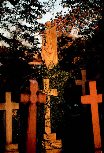 "אתה איש צעיר בחופשה, אתה חייב לעצמך קצת בידור, בוא ותראה את הגולגלות"… כך אומר הזקן הצולע, שומר בית הקברות, לג'רום ק. ג'רום, בפרק השביעי של "שלושה בסירה אחת". ניסיון של שנים יש לזקן, והוא יודע כי בין המטיילים יימצא תמיד משוגע לקברים, מציבות וכתובות מטושטשות (ורצוי שיהיו מכוסות בטחב). אבל ג'רום, כפי שאתם זוכרים, לא היה הקליינט הכי מוצלח של הזקן. "אתה רוצה לראות את הקברים?" שואל הזקן. "לא", כועס ג'רום, "אני רוצה לעמוד כאן ככה, ולהישען על הקיר הישן הזה, אז הסתלק ואל תפריע לי. כולי מלא רוך, יופי ומחשבות נשגבות, וככה אני רוצה להמשיך ולעמוד ולחוש את כל היפה והנעים, ואתה מתפרץ ורומס את הכל עם השטויות שלך על קברים ומציבות. עוף מכאן, זקן עלוב, וחפש מישהו שיקבור אותך ואני אשלם חצי מהעלות". וכשהזקן ממשיך להטריד אותו, אומר לו ג'רום בכעס, שאם הוא רוצה לראות קברים, יש לו מספיק קברים משלו, והוא מונה אותם: "הקבר של הדוד פוג'ר ב'קנסל גרין', הקבר של סבא שלי ב'בו' שיש בו מקום לשמונה אורחים, קבר הלבנים של דודתי סוזן שיש עליו תבליט משיש של קומקום קפה, שעלה לנו הרבה כסף". מידע נוסף: לוּ היה הזקן פונה אלי במקום אל ג'רום, הייתי מביא לו הרבה נחת. אני שייך לציידי הקברים והמציבות, ובנושא זה יש ללונדון הרבה מה להציע לי. ההבדל בין בתי הקברות האנגליים לצרפתיים דומה להבדל בין הגנים האנגליים לגנים הצרפתיים. בלונדון כמעט אין בתי קברות מסודרים ומבריקים כמו הפר לאשז או המונמארטר, ובוודאי לא אוסף ארמונות כמו בבית הקברות של גנואה. חלקים גדולים של בית הקברות בהייגייט (Highgate), בית הקברות המתויר ביותר בלונדון, נראים כאילו אין יד אדם נוגעת בהם. מי שירצה להגיע לקברה של ג'ורג' אליוט, למשל, לא ימצא דרך סלולה בסבך. רוב אנשי השם – מלכים, אנשי אצולה, אנשי רוח וגיבורי מלחמה – קבורים בכנסיות של מרכז לונדון, בעיקר בכנסיית ווסטמינסטר אבי – מבוך מסתורי ותרבותי מרתק, שאוהבי הקברים יבלו בו ימים אחדים. בחרתי להביא כאן את סיפוריהם של שישה אתרי קבורה בלונדון – חמישה מהם בתי קברות לבני אדם, ובית קברות אחד לחיות מחמד. גבעת העצמות בבנהיל פילדס כמה מאות מטרים צפונית לסיטי של לונדון, ממערב לסיטי רוד, באיזור שנקרא פינסבורי (Finsbury), נמצא בית קברות קטן ומפתיע – בנהיל פילדס (Bunhill Fields). הכניסה אליו היא מול המרכז המתודיסטי וביתו של ג'ון ווסלי, שקבור במרכז עצמו. הקרבה אל הכנסייה המתודיסטית אינה מקרית. בית הקברות של בנהיל הוא אתר קבורה של הנון־קונפורמיסטים – שם כללי באנגליה לכ־300 הכיתות הנוצריות שאינן שייכות לאנגליקנים או לקתולים, ובעיקר לאלה שהתנגדו לטקסי הקבורה על פי ספר התפילות Book of Common. השם בנהיל הוא כנראה סירוס של השם Bone Hill (גבעת העצמות). כאן היה בור ענק שנקברו בו חללי מגיפות, ובמגיפה הגדולה של שנת 1665 נקברו כאן יותר מ־100,000 אנשים. מי שמזדמן הנה במקרה, מופתע לראות את "שלושת הגדולים" של האתר הזה, שאם היו  | | חצר הקבורה בכנסיית סנט ג'ון, אחת הפינות השקטות ביותר בלונדון. ההבדל בין בתי הקברות האנגליים לצרפתיים דומה להבדל בין הגנים האנגליים לגנים הצרפתיים. בלונדון הם נראים כאילו אין יד אדם נוגעת בהם |