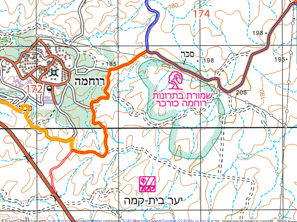 • עונה מומלצת: חורף או אביב, כשהכל מוריק והטמפרטורות נמוכות יחסית. בסוף ינואר ותחילת פברואר בולטת באזור פריחת הכלניות האדומות • התאמת המסלול: לכל המשפחה • קושי המסלול: קל • מפת סימון שבילים: "מישור חוף הנגב (הנגב המערבי)", מפה מס' 13 • הגעה מהמרכז: נוסעים דרומה בכביש מס' 40 עד צומת בית קמה. בצומת פונים ימינה בכביש מס' 293. כעבור כשני קילומטרים וחצי פונים צפונה (ימינה) בכביש מס' 334 "דרך ארץ הבתרונות", לעבר רוחמה ושדרות. כעבור שישה קילומטרים נגיע אל פניה ימינה שמשולטת בחום – "בתרונות רוחמה". השביל מתפתל בין הגבעות, נצמד לגדר המזרחית של קיבוץ רוחמה, ופונה מזרחה. בקטע זה חולפת הדרך בשוליה הצפוניים של שמורת הטבע וניתן להשקיף ממנה על הבתרונות. סביב נקודת התצפית אפשר לעצור ולצאת להליכה רגלית. אם נגיע לכאן בעונה הנכונה, מובטחים לנו מרחבים מופלאים וצבעוניים. בשמורה אין שבילים מסומנים, ולכאורה אפשר להלך בה בחופשיות, אך חשוב מאוד להקפיד ולא לרדת מהשבילים כדי לא לרמוס את הצמחייה. גבעות רוחמה הן שריד של רכס הכורכר המזרחי ביותר במישורי הנגב המערבי. האזור כולו מכוסה באדמת לס רכה הנאטמת למים לאחר הירטבותה. מי הסחף ממוטטים את אדמת הלס שבשולי הערוצים וגורפים את העפר, דבר היוצר את התופעה האופיינית לאזור הקרויה בתרונות. ייחודה של שמורת רוחמה הוא בכך שבשיאי הגובה באזור נחשף רכס הכורכר שבכל יתר המקומות מכוסה על ידי שכבת לס עבה. סוג הקרקע הייחודי מאפשר מפגש נדיר בין חברות צומח שונות, וכך נוצרים מינים בוטניים רבים ומגוונים. רוב הצמחים בשמורה הם צמחי בתת הספר הים-תיכונית, למשל – קורנית מקורקפת (אחד ממרכיבי הזעתר) ומרוות שונות. בעונת הפריחה (חודש פברואר) עוטה האזור מרבדי פריחה אדומים של כלניות (ובעקבותיהן נוריות אסיה). על הכלניות מתווספים פרחי בר רבים – סביונים, מצליבים ופרפרניים רבים ופרחים נדירים יותר כגון: צבעוני ההרים, אירוס ארצישראלי, דבורניות וסחלבים. כשהקיץ נראה בפתח מתכסים חלקים בשמורה במרבדי חרציות המציינות את ראשיתה של עונת היובש. על רכס הכורכר גדלה צמחייה מגוונת הכוללת שיחים רב-שנתיים רבים שחלקם מגיעים מאזורי הנגב המדבריים. למשל, מיתנן שעיר ושמשון השלחופות. במתכונתה הנוכחית הוקמה רוחמה בשנת 1943, אך קדמו לכך שלושה ניסיונות היאחזות שהחלו עוד בשנת 1911 (כחווה חקלאית, שאדמותיה נרכשו עשרים שנה קודם לכן). גם ניסיונות ההיאחזות המאוחרים יותר נכשלו. כמו נקודות דרומיות אחרות, לאחר הקמתה הפכה רוחמה לבסיס חשוב להתיישבות היהודית בנגב וממנה יצאו צוותי התיישבות במבצע 11 הנקודות באוקטובר 1946. במלחמת העצמאות עמד הקיבוץ במצור מצרי ממושך וחולץ במבצע "אבק". אבק הוא פרס ניחומים בו זוכה כל מי שמאחר ומגיע בתום עונת הפריחה. מפת איזור בתרונות רוחמה:לקריאה נוספת: