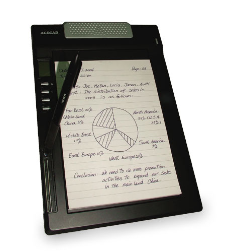 בלוק כתיבה דיגיטלי: לחובבי שרבוט מי שלא הסתגל למקלדת ולעכבר ומי שמעדיף לשרבט ביד בעת סיעור מוחות פורה במיוחד יכולים להיעזר ב־DigiMemo, לוח גרפי דיגיטלי שמגיע מצויד בבלוק כתיבה, בעט ובזיכרון פנימי של 8 מגה עם אפשרות להרחבה. רשימות, הערות ושרטוטים יועברו בלחיצת כפתור ובאמצעות כבל USB היישר אל המחשב כקובץ סרוק בפורמט JPG (מחיר: 640 שקל ברשת שקם אלקטריק). | |