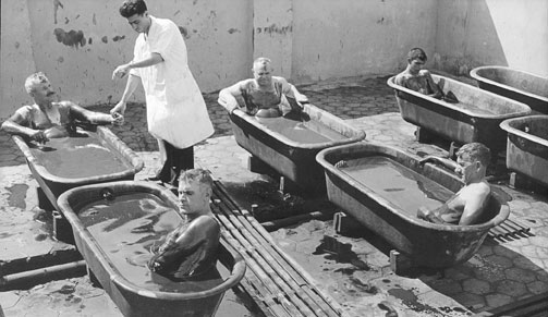 צילומים המתעדים את הטיפולים במקום בשנות הששים מראים מטופלים יושבים, איש איש באמבט משלו, בתוך מקבץ אמבטיות מלאות בנוזל שחור בחצר אתר המרפא. היום יושב כל מטופל באמבטיה בתוך המרכז הרפואי,