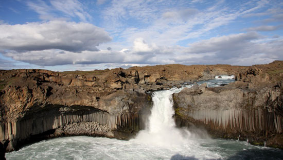 מפלי אלדייר (ALDEYJARFOSS), בקצה הצפוני של דרך F26, הם מפלים קלאסיים הנוצרים במעבר בין שכבות קשות לרכות – במקרה זה במעבר מהרמה האיסלנדית אל העמקים שבצפון האי (לכיוון מפרץ הוסאויק HUSAVIK). הנהר זורם על השכבה הקשה, ובהגיעו אל השכבה הרכה נוצר קניון בשכבה זו. ככל שחולפות השנים מצליחים המים להשיג את המצוק הקשה לאחור וליצור קניון מצוקי ויציב יותר. בתמונה נראים משושי ענק בשתי שכבות שונות (ראו גם בצילום הבא):