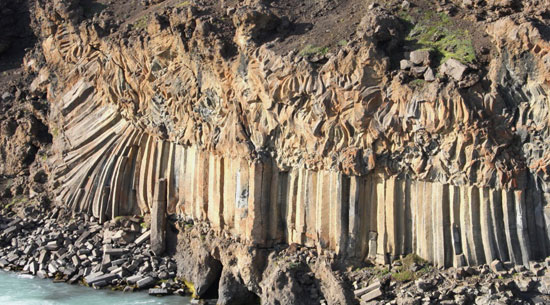 מצוקי בזלת בקניון של מפלי אלדייר. כאן ניתן לזהות שני אופקים המורכבים ממשושים: האופק התחתון מאופיין במשושים גדולים, ארוכים ואנכיים – רוחבו של כל משושה נע בין עשרות סנטימרים עד קרוב למטר ואורכם מגיע לעשרה מטרים. האופק העליון מאופיין במשושים קטנים ודקים בהרבה, ובאופן בולט אינם מסודרים אלא בנויים במעין גושים. שונות זאת נובעת ככל הנראה מהבדלים בצמיגות ובטמפרטורה בין שני שפכי הלבה השונים בעת התגבשותם.