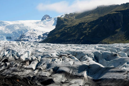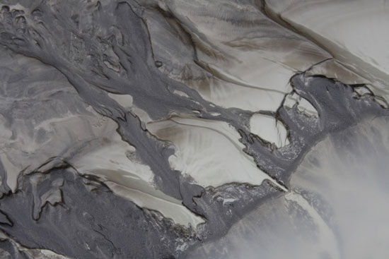 בוץ בערוץ נחל יוקולסה-א-פיולום. זרימתו של נהר היוקולסה אינה אחידה ויש גם תקופות בהן הכל קופא. בתקופת האביב והקיץ אופי זרימתו של הנהר מאופיין בשטפונות. לאחר כל שטפון שוקע הסחף ומתקבלת הפרדה טבעית בין מרכיבי הסחף על פי גודלם ומשקלם. בתמונה ניתן לראות הפרדה בין מרכיבים וולקניים שונים ומתקבל שיכוב מיקרוסקופי המאובחן בגוונים שונים של סחף ואפר וולקני. בהזדמנות זאת נתקבל גם דגם מרתק של אגני סחיפה. דגם זה דומה מאוד בצורתו לאגני סחיפה של נהרות קטנים וגדולים כאחד (גודל הקטע המצולם כחצי מטר רבוע).