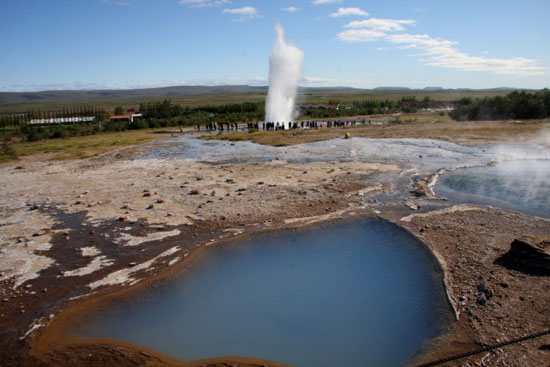 גייזרים באיסלנד. בשל החום הרב השופע מן האדמה במקומות רבים באיסלנד יש שפע של מעיינות חמים. בתנאי קרקע מסוימים נוצרים מעברים עמוקים מאוד של מים, שצורתם כמעין צינור ארוך. שפיעת החום מחממת את המים שלמטה, והמים הקרים יותר משמשים כמעין פקק. כאשר החום בחלק התחתון יוצר לחץ שעוצמתו גדולה יותר ממשקל המים הקרים שמעל – נוצר חוסר איזון שמביא את המים החמים להדוף את המים מעל וכך מתפרץ גייזר (מילה שמשמעה באיסלנדית "מים גואים"). כיוון שביום נתון שפיעת המים אחידה וכן שפיעת החום אחידה – מתקבל מרווח זמן אחיד בין התפרצות אחת לשנייה. בגייזר שבתמונה, למשל, מתפרץ אחת לארבע-חמש דקות בממוצע.