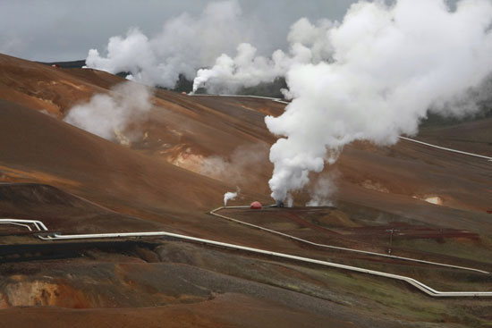 אגן הגייזרים הפעיל מצפון לאגם מיוואט – קראפלה. בצילום אפשר לראות צנרת ונקודות שחרור לחץ של מערכת איסוף הקיטור הטבעי אל תחנת הכח.