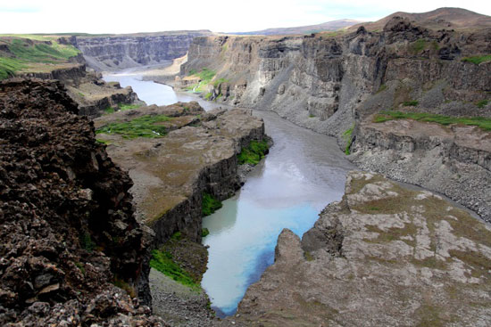 נהר יוקולסה-א-פיולום. מפל דטיפוס (DETIFOSS) נחשב לעוצמתי ביותר באירופה בשל השילוב בין גובהו (כ-44 מ') לבין עוצמת זרימתו המגיעה לכדי 210 טון מים לשנייה. עוצמת זרימה כזו אכן מעצבת את הקניון המרשים, אולם יש עדויות המראות כי ערוץ הזרימה הנוכחי של הנהר הוא חדש יחסית (בן אלפי שנים) ושהקניון העצום נפער בבת אחת כתוצאה משטפון עצום מימדים שהתרחש עקב התפרצות וולקנית עצומה בקרחון ווטנה, שמהווה את מקור המים העיקרי לנהר. על פי העדויות, התפרצות הר הגעש הביאה להמסה של כמויות קרח עצומות בזמן קצר והזרימה האדירה הביאה לשינוי הנתיב המקורי של הנהר. ערוצו הנטוש של הנהר נמצא במרחק של מאות מטרים עד קילומטרים מערבית לנתיב הזרימה הנוכחי.