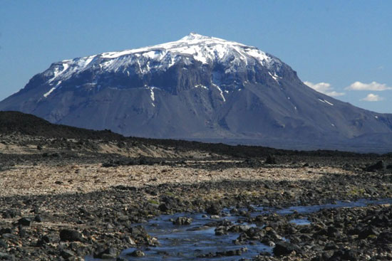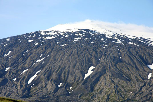 הר הגעש סנייפל. הר געש במערב איסלנד, שצורתו אמנם קונית, אך השיפועים שלו מתונים מאוד. במבט על פני השטח של השיפועים בכל היקפו של ההר רואים בבירור שהלבה זרמה באופן אחיד יחסית על פני השטח כולו. צורת זרימה זו מאפיינת הרי געש שמפיקים לבה נוזלית יותר מהרגיל, ויוצרים שיכוב ברור של בזלות התפרצות אחרי התפרצות. מיקומו של הר געש זה מוסט מאזורי הפעילות של שיא הרכס המרכז אוקיאני באיסלנד, וככל הנראה קשור בפעילות וולקנית ממקור נפרד (נושא זה נמצא במרכז המחקרים האחרונים של הגיאולוגיה באיסלנד, ואין עליו עדיין הסכמה מלאה).