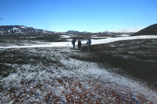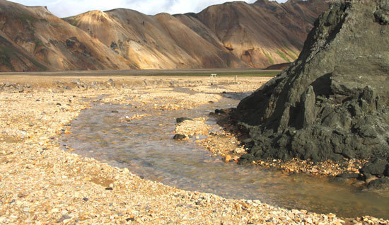 ריוליטים בלנדמנלאוגר. בתמונה מוצאו של הערוץ הקטן (שמופיע בתמונה הקודמת) אל פשט הנהר הגדול המנקז את האזור כולו. ניתן להבחין במישור הנרחב של הערוץ המרכזי שרוחבו מאות מטרים ויותר והוא מאופיין בחלוקי נחל ריוליטים בהירים.