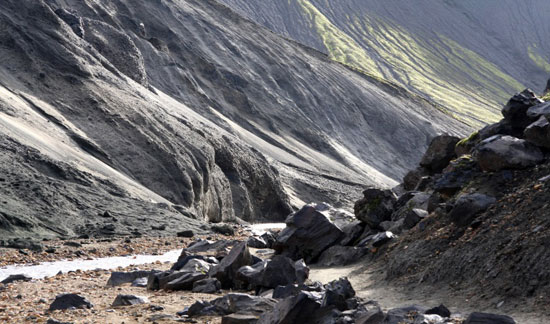 ערוץ נחל קטן בלב שמורת לנדמנלאוגר. הנחל זורם על קו תפר בין שפך בזלת קשה (מימין) וסלעי ריוליט אפורים ורכים (משמאל) בתחתית הערוץ חלוקי ריוליט בהירים וצבעוניים שמקורם במעלה הערוץ.