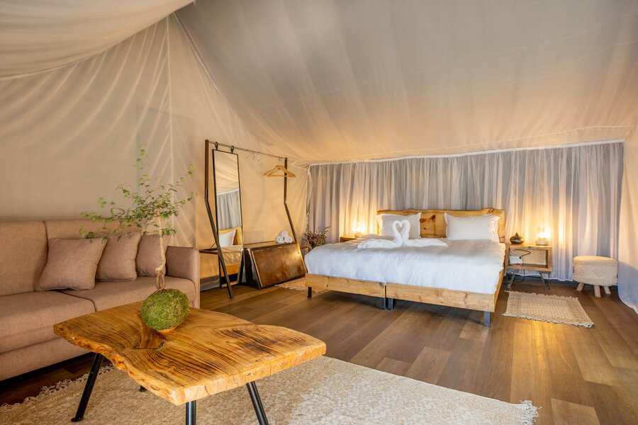 על אף שהטבע נמצא ממש בחוץ, פנים האוהל לא מבייש מלון בוטיק מוקפד – רצפת פרקט, מיטה זוגית מזמינה ונוחה, ספה שנפתחת למיטה זוגית נוספת, מזגן, מאוורר תקרה וגם חדר רחצה מפנק שמהווה חלק בלתי נפרד מהאוהל, ובו שירותים, כיור ומקלחת עם ראש גשם. האוהל מרוהט ומאובזר בטוב טעם, עם פריטים שתשמחו לאמץ גם לבית, ובעלי המקום, נועה ויותם, חשבו על כל פרט קטן שיכול להנעים לכם את החופשה: ערכת עזרה ראשונה (כולל דוחה יתושים וג'ל אלוורה למקרה ששכחתם בבית), פינת קפה ותה מאובזרת, כולל עוגיות טעימות, חלב במקרר, תאורת לילה, ספרים ומגזינים, משחקים ואפילו תיבת הפתעות עם עפרונות צבעוניים, צבעי מים וזכוכית מגדלת שאפשר לחקור איתה את הטבע מסביב. מטבח השדה המאובזר שנמצא מחוץ לאוהל כולל כירת גז, שולחן אוכל, כיור לשטיפת כלים וכלי בישול ואוכל. מחוץ לכל אוהל יש פינת מדורה, מוכנה כבר עם העצים ועם בולי עץ מסביב, עליהם תוכלו לשבת.
