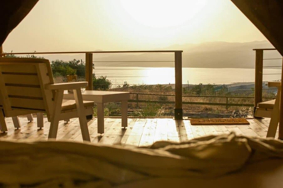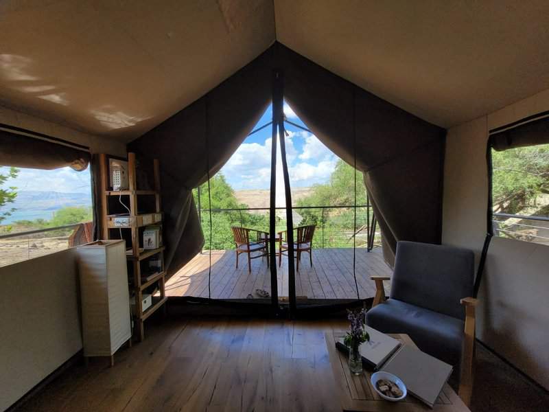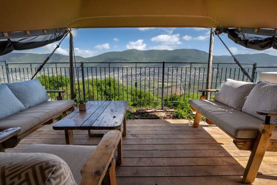 הנוף היפה של הכנרת שנשקפת מכל פינה הוא הסיבה העיקרית להגיע לחופשה למתחם הגלמפינג במושב רמות שבדרום הגולן, אבל בהחלט לא הסיבה היחידה. מדובר במתחם גלמפינג מושקע ובוטיקי ובו ארבעה אוהלים בלבד, שניים בגודל בינוני שמתאימים לזוג או זוג עם שני ילדים קטנים ושני אוהלי ספארי גדולים. לכל אוהל שירותים ומקלחת משלו, מחוץ לאוהל אך צמודים לו. חווית הקרבה לטבע ממשיכה גם במקלחת, שלה קיר בזלת וגג שקוף דרכו תוכלו לראות את השמים ואת הכוכבים. לא רק חווית המקלחת מפנקת כאן, אלא גם השינה – מיטה כמו שיש כאן לא תמצאו גם בבתי מלון רבים – מיטת קינג סייז ברוחב 1.80 ובאורך שני מ', עם מזרן נוח במיוחד. מחוץ לאוהל יש מרפסת עם פינת ישיבה, ממנה תוכלו להשקיף על שקיעות מרהיבות מעל הכנרת.