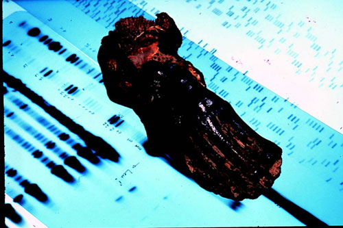 ממסע קונטיקי לסלילי הדנ"אלא רק לדנ"א העתיק יש פוטנציאל לפתור חידות מהעבר. רוב המחקרים הגנטיים מתבצעים כיום על דנ"א שבודד מאנשים חיים, ואשר הסליל הכפול שלו נושא, לדברי המומחים, רמזים לגבי ההיסטוריה הכוללת של המין האנושי. בשנת 1986 השתמשו מדענים בדנ"א מיטוכונדריאלי (ראו מסגרת), המועבר רק דרך | | מדען בוחן דגימה של דנ"א. גנטיקאים רפואיים מחפשים מוטציות של גנים המקשרות בין מחלה לפרטים נגועים. אנתרופולוגים, גיאוגרפים ואחרים מתעניינים בהבדלים בין מקטע דנ"א מסוים של אדם אחד לזה של אדם אחר | צילום: מקסימיליאן סטוק, SPL |