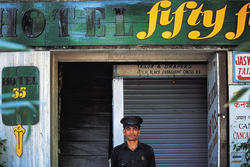 | "שמי וינוֹד קְוְומֶר, אני שומר בהוטל פיפְטי פַיְיב, שנמצא בקוֹנוֹט פלייס (Connaught Place) בדלהי (Delhi). זו השנה הרביעית שאני עובד כשומר במלון בהודו, ופעם בשנה אני נוסע לבקר את אשתי וילדי הגרים בנפאל, כשישים קילומטר מפוֹקהרה (Pokhara). יש לנו שתי בנות ובן, הילדה הכי גדולה בת עשר. לפני כארבע שנים עברתי להודו כדי להרוויח יותר כסף. בנפאל הרווחתי בערך 35 דולר בחודש. כאן אני מרוויח שישים דולר, כמעט פי שניים. "קשה לי המרחק מאשתי ומהילדים, אבל מחזקת אותי הידיעה שילדי יוכלו להמשיך ללמוד, מה שאני לא יכולתי לעשות. בנפאל הלימודים הם חינם לבנים עד הכיתה השביעית ולבנות עד הכיתה העשירית. אחר כך צריך לשלם. אני למדתי עד הכיתה השביעית, ואז יצאתי לעבוד. שנה וחצי לאחר מכן התחתנתי. אני שוכר חדר זול במרחק 18 קילומטרים מדלהי. כל יום אני נוסע ברכבת לתחנה בדלהי ומשם ממשיך בריקשה. קשה לגור רחוק מהבית, מהנופים ומהתרבות שגדלתי בהם, אבל מה שחשוב לי זה שעתיד ילדי יהיה טוב יותר משלי. בעוד כחודשיים אני נוסע הביתה, וזאת לא בושה לספר לך שאני סופר כל שעה". |
