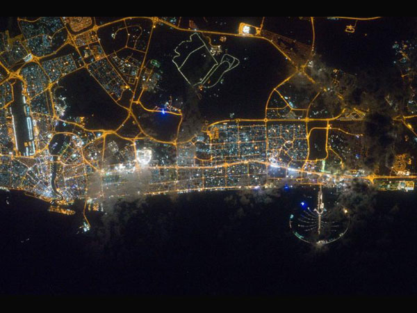 דובאי, אחת משבע האמירויות המרכיבות את איחוד האמירויות הערביות, היא אתר צילום חביב על אסטרונאוטים בתחנת החלל הבינלאומית. הסיבה לכך היא האיים המלאכותיים במפרץ הפרסי, שאת צורתם המיוחדת – בדוגמת עץ תמר – ניתן לראות במלואה רק ממעוף הציפור, ממטוס וכמובן גם מתחנת החלל (לחצו על התמונה כדי להגדיל אותה). בלילה אורות דובאי יוצרים כמה תבניות צורניות מעניינות: הכבישים המהירים והרחובות הראשיים מסומנים באופן ברור בתאורה כתומה בוהקת, אזורי המסחר והמגורים מוארים בנקודות אור בודדות בצבעי לבן, צהוב וכחול, ובלבם אפשר להבחין בכמה אזורים המוארים בתאורה לבנה בולטת במיוחד. אלו הם מרכזי קניות העצומים והמלונות הגדולים, בהם בורג' ח'ליפה, הבניין הגבוה בעולם שמיתמר לגובה של 828 מטר. אורות העיר המנצנצים מהווים ניגוד עז לאזורי המדבר הלא מפותחים שמדרום-מזרח, ואיי התמרים בולטים על רקע המפרץ הפרסי החשוך כולו. תמונה אחת המספרת את סיפורה של דובאי על כל הניגודים שהוא מכיל. לקריאה נוספת:
