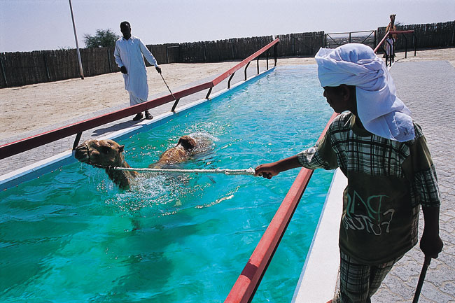 בריכת שחייה מיוחדת במינה משמשת לביצוע תרגילי כושר לגמלי המירוץ. כדי לבנות כושר גופני אופטימלי לקראת עונת המרוצים או כדי לשקם גמלים פצועים בתוכנית פיזיותרפיה מיוחדת, מבלים בעלי החיים היקרים מדי יום בבריכה, וביום שישי, הם מתנערים מתוכנית האימונים לכבוד יום המרוצים.
