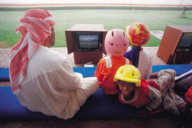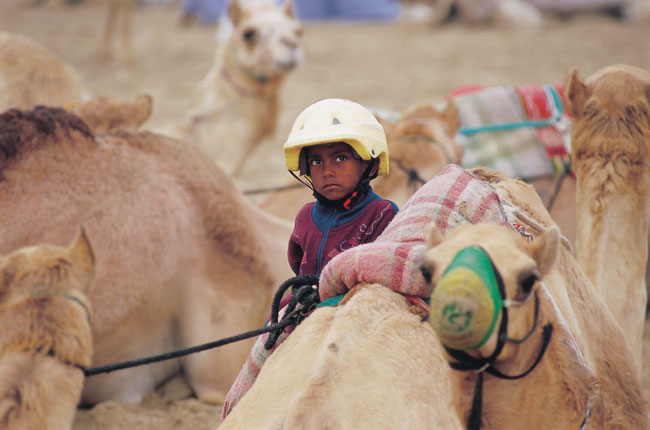 ילד רוכב על גמל בתחרות. לעיתים מונעים מהילדים אוכל כדי שלא ישמינו, ולפעמים מדביקים בדבק את רגליהם לגמל כדי שיישארו על גבו בעת המירוץ