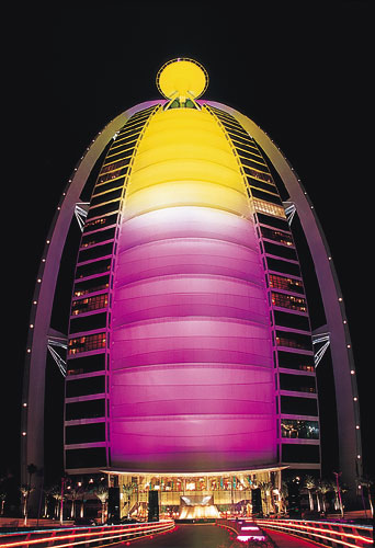 מלון בורג' אל-ערב, המלון הגבוה בעולם, שעלות הקמתו הגיעה לשני מיליארד דולר. המבנה, שמתנשא לגובה של 321 מטר, מואר בשלל צבעים זוהרים המשתנים כל הזמן