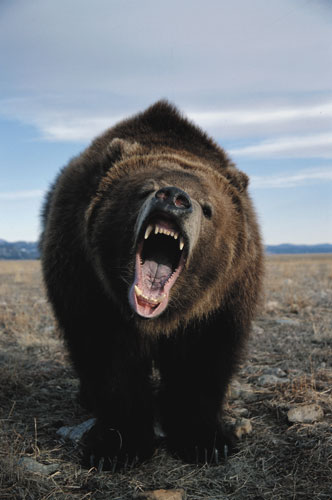 | ברוב המקרים כשדוב גריזלי פוער את פיו וחושף את שיניו, זו אינה אלא הצגה, שתכליתה להזהיר את הסובבים כי יתרחקו ממנו. רק לעתים רחוקות גורר עימו איום זה תקיפה |