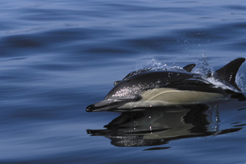 דולפין מצוי. לסנפיר הגב צורת משולש ובמרכזו יש כתם לבן שצורתו משתנה מפרט לפרט – דבר המאפשר להשתמש בסנפיר הגב לזיהוי הפרטים השונים בלהקה צילום: אימג'בנק ישראל |