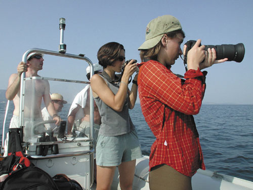 צוות המחקר בפעולה. מטרתו של המחקר בים היוני היא לחקור את נסיבות הידלדלות אוכלוסיית הדולפין המצוי, ובכל קיץ הארגון פותח את שעריו למתנדבים מכל העולם הרוצים להשתתף במאמץ המחקרי צילום: Tethys Research Institute |