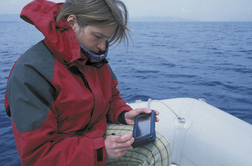 אחד מחברי הקבוצה מזין בזמן אמת את הנתונים שנאספו בשיט המחקר לקטלוג ב-Palmtop. מלבד אנשי טתיס וכמה תיירים קבועים שמגיעים בקיץ, חיים באפיסקופי דרך קבע רק כעשרה תושבים. אנשי הארגון מכונים בפי המקומיים "אנשי הדולפין" צילום: Tethys Research Institute |