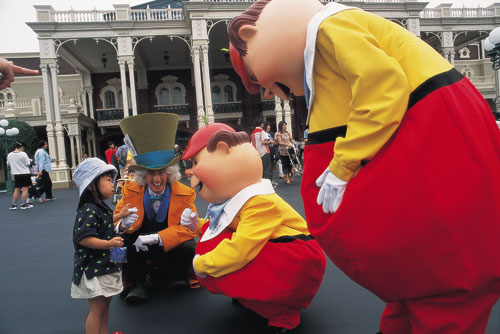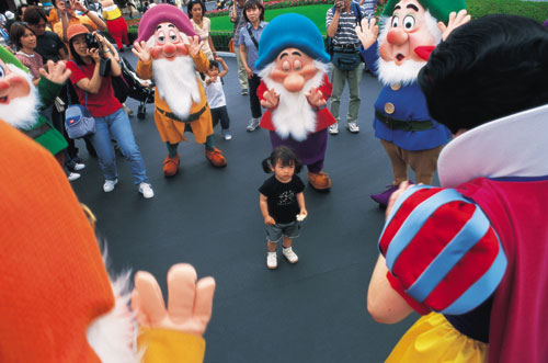 של קביעות, שכר לפי ותק וועד עובדים. התרבות השנייה (של העובדים הזמניים) היא אמריקאית, והיא נשלטת בידי ספרי ההדרכה הקרויים בשם הכללי "הדרך של דיסני" ("Disney Way"). אלה ספרי הדרכה שיובאו מארצות הברית ותורגמו ליפנית. במהלך התרגום הושמטו קטעי הדרכה שלא היו נחוצים לדעת המנהלים היפנים, למשל תרגילי עבודת צוות. עובדים יפנים עוברים הכשרה לעבודת צוות כבר מגן הילדים, ולכן מבחינת המנהלים תרגילים אלה הם השקעה מיותרת. בארצות הברית עובר המועמד לעבודה זמנית בדיסנילנד ראיון, הכולל הסבר ביחס לדרישות העבודה (כגון קוד לבוש והופעה וכן עבודה בסופי שבוע ובחגים). ביפן בוטל הסבר זה, מכיוון שגם הוא נחשב על ידי ההנהלה למיותר. התרבות החזקה של "תורת דיסני" למעשה איננה כה חזקה במונחים יפניים. התאמתה לנורמות מקומיות התבררה כאחת הסיבות להצלחתו של הארגון היפני. פוגשים את העולם הביקור בדיסנילנד משווק ונמכר בכל העולם כבעל אופי אחיד ואוניברסלי. מבט מבעד למשקפיים האנתרופולוגיים יראה לנו כי הדבר איננו כך. דיסנילנד הוא בעל משמעות שונה לקבוצות שונות של מבקרים. מבחינת הילדים שגדלו על תוכנית הטלוויזיה המקומית של מיקי מאוס דובר היפנית, ביקור בדיסנילנד הוא טיול לביתם של מיקי, מיני, דונלד וגופי. בשנים האחרונות הפך הפארק למוקד משיכה לטיולים מאורגנים של בתי ספר, והוא מתחרה רציני של אתרי טיול מסורתיים, כגון קיוטו וניקו (Nikko). עבור מתבגרים מאיזור טוקיו משמש הפארק אתר פופולרי ליציאה בלוויית בן או בת זוג. אין בחורה שתסרב להזמנה לטוקיו דיסנילנד. יתרה מכך, נשים יפניות צעירות הפכו את מוצרי הצריכה של דיסני טוקיו לסימן הכר של היתממות ילדותית מפתה. במשך חגיגות השנה החדשה הופך הפארק לאתר המוני של עלייה לרגל, בנוסח מקדשי שינְטוֹ. מיקי ומיני מולבשים בקימונו מסורתי, והפארק מקושט בסגנון יפני. | טוקיו דיסנילנד הוא הפארק הפופולרי ביותר ביפן ואחד מהפארקים המצליחים ביותר בעולם |