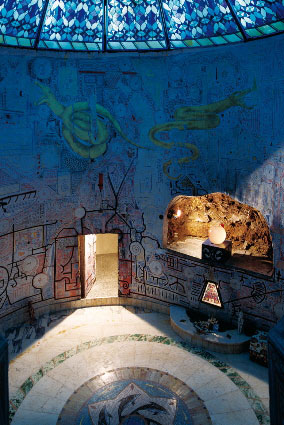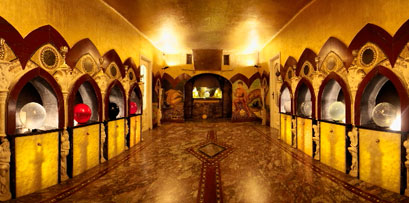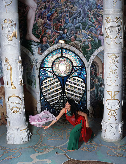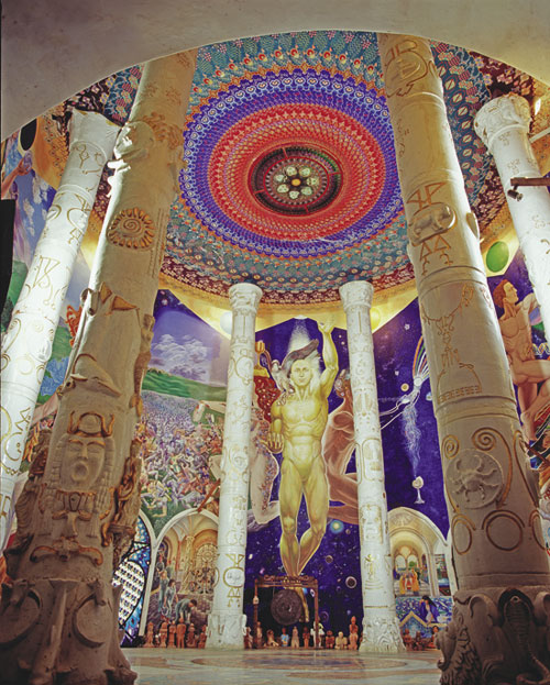 בתוך המקדש ישנם שמונה אולמות, שכל אחד מהם מוקדש למוטיב אחר: האולם הגדול ביותר נקרא אולם המראות, כיוון שהוא מוקף במראות מכל צדדיו. הקירות משופעים קלות, מה שיוצר אינספור השתקפויות, וגורם למבקר להרגיש שהוא כמו אליס בארץ הפלאות. אולם גדול אחר הוא אולם האדמה העליון, שעל קירותיו מצוירת כל ההיסטוריה האנושית מנקודת מבט אזוטרית. אולמות נוספים הם אולם האדמה התחתון, שעל תקרתו יש ייצוג של הכוכבים בשמיים בצורה זוהרת, שמדמה את שמי הלילה. אולם המתכות קשור לתורת האלכימיה, החדר הכחול משמש למדיטציה, באולמות המבוך יש ייצוג למאה אלוהיות שונות שהשפיעו על המין האנושי, כולל האלוהות היהודית. לב המקדש הוא חדר שנראה כמו קודש הקודשים בירושלים, בכך שקירותיו ותקרתו מצופים זהב. בתוך החדר ישנם גביעים מקודשים, פסלים של חיבור בין אישה וגבר וכדורי בדולח אלכימיים.