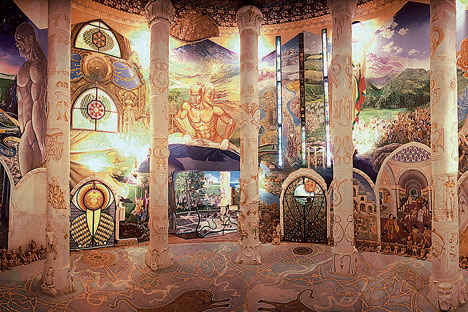 בתוך המקדש ישנם שמונה אולמות, שכל אחד מהם מוקדש למוטיב אחר: האולם הגדול ביותר נקרא אולם המראות, כיוון שהוא מוקף במראות מכל צדדיו. הקירות משופעים קלות, מה שיוצר אינספור השתקפויות, וגורם למבקר להרגיש שהוא כמו אליס בארץ הפלאות. אולם גדול אחר הוא אולם האדמה העליון, שעל קירותיו מצוירת כל ההיסטוריה האנושית מנקודת מבט אזוטרית. אולמות נוספים הם אולם האדמה התחתון, שעל תקרתו יש ייצוג של הכוכבים בשמיים בצורה זוהרת, שמדמה את שמי הלילה. אולם המתכות קשור לתורת האלכימיה, החדר הכחול משמש למדיטציה, באולמות המבוך יש ייצוג למאה אלוהיות שונות שהשפיעו על המין האנושי, כולל האלוהות היהודית. לב המקדש הוא חדר שנראה כמו קודש הקודשים בירושלים, בכך שקירותיו ותקרתו מצופים זהב. בתוך החדר ישנם גביעים מקודשים, פסלים של חיבור בין אישה וגבר וכדורי בדולח אלכימיים.