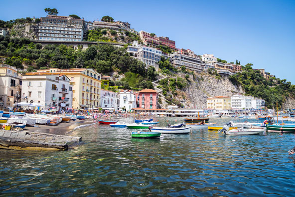 אל נאפולי תוכלו להגיע מרומא בתוך שעתיים וחצי, באמצעות רכבת או רכב שכור. תוכלו ללון באחד מבתי המלון הרבים, או להמשיך ממנה את המסע שלכם בקמפניה. יש בה מרכז עתיק (Centro Storico), מוזיאונים טובים (בהם המוזיאון החשוב לארכיאולוגיה), ארמון היסטורי (Palazzo Reale), כנסיות בארוק, פיצריות (כאן נולדה הפיצה) וגם סבך רחובות וסמטאות שיבטאו בצורה הנכונה ביותר את התרבות המקומית. סורנטו – היפה שבסירנות במרחק של כ-28 ק"מ מנאפולי, על גלריה מעל קו חוף אמלפי, צופה להר הגעש ווזוב ולמפרץ נאפולי, ניצבת סורנטו (Sorrento) במלוא תפארתה. היא נקראת על שם סירנות הים המיתולוגיות, לאורכה חופים זהובים ותכולים, וילות עתיקות, רחובות צרים, שלל חנויות וכמובן מסעדות מקומיות. פיאצת טאסו (Piazza Tasso) היא המרכזית שבעיר, סביבה ריכוז אותם אתרים ואותן חנויות, ותחתיה חוף הים. אתרים מעניינים בסורנטו, לצד שיטוט נעים בין הסמטאות ולאורך הנמל, הם מוזיאון קוריאלה (Piazza Tasso), בו יצירות אמנות מהמאה ה-18, וילה קומונאלה (Villa Comunale), ממנה יש את אחת מנקודות התצפית המוצלחות בעיר, וגם כנסיית סן פרנצ'סקו (Chiesa di San Francesco). .jpg) סורנטו, הנקראת על שם סירנות הים המיתולוגיות