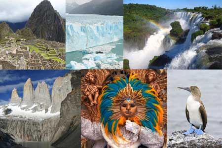 | נתונים כללים דרום אמריקה (אמריקה הדרומית) משתרעת על פני שטח של 17,815,000 קילומטרים רבועים (כ-12 אחוז משטחו היבשתי של כדור הארץ), היא היבשת הרביעית בגודלה אחרי אסיה, אפריקה ואמריקה הצפונית, וחיים בה כ-384 מיליון בני אדם, שהם כשישה אחוזים מאוכלוסיית העולם. בשטחה נמצאות 13 מדינות: ברזיל, ונצואלה, קולומביה, אקוודור, פרו, בוליביה, צ'ילה, ארגנטינה, פרגוואי, אורוגוואי, גיאנה, סורינם והטריטוריה גיאנה הצרפתית (השייכת לצרפת). גיאוגרפיה גבולותיה של דרום אמריקה הם האוקיינוס האטלנטי במזרח ובצפון מזרח, האוקיינוס השקט במערב והים הקריבי ומרכז אמריקה בצפון. הנקודה הדרומית ביותר ביבשת היא כף הורן, האי הדרומי שבאיי טיירה דל פואגו (פירוש השם: ארץ האש). אורך היבשת מצפון לדרום הוא 7,400 קילומטר ורוחבה המקסימלי הוא 5,160 קילומטר. היבשת נחלקת לכמה אזורים: החלק הצפוני שכולל את הגינאות, ונצואלה וקולומביה; החרוט הדרומי שכולל את צ'ילה, ארגנטינה, אורוגוואי, פרגוואי וברזיל, והחלק המרכזי שכולל את המדינות האנדיות פרו, בוליביה ואקוודור. בחלקה הצפוני של היבשת עובר קו המשווה, כך שרוב שטחה נמצא בחצי הדרומי של כדור הארץ. רכס הרי האנדים נמתח לאורך חופה המערבי של היבשת, מצפון לדרום, ואורכו 8,800 קילומטר. זהו רכס ההרים השני באורכו בעולם, אחרי ההימלאיה. אגן האמזונס משתרע על רוב השטח שבצפון היבשת. הנקודה הגבוהה ביותר בדרום אמריקה היא פסגתו של הר אקונקגווה (6,960 מטר מעל פני הים) ברכס האנדים בחלק שנמצא בארגנטינה. הנקודה הנמוכה ביותר נמצאת אף היא בארגנטינה, בחצי האי ולדס, וגובהה 40 מטר מתחת לפני הים. אוצרות טבע: דרום אמריקה עשירה יחסית באוצרות טבע ובמחצבים: זהב חיפשו ומצאו בעיקר ברכס האנדים ובברזיל הרבה לפני הגעת האירופאים. כסף, כספית, נחושת, בדיל, עופרת ואבץ יש בהרים שבין מרכז פרו ודרום בוליביה. נחושת יש גם בצפון ובמרכז צ'ילה ובמרכז ובדרום פרו. ברזיל עשירה גם ביהלומים ובאבני חן. נפט וגז טבעי יש ממזרח לרכס האנדים: בוונצואלה, בקולומביה, באקוודור, בפרו, בבוליביה, בארגנטינה ובצ'ילה. ונצואלה היא אחת ממפיקות הנפט הגדולות בעולם, בתחילת שנות השמונים למשל היווה הנפט 95 אחוז מסך כל היצוא שלה. אולם חלוקת המשאבים אינה שוויונית, בפרגוואי ובאורוגוואי כמעט ואין אוצרות טבע. אקלים בדרום אמריקה כמה אזורי אקלים. אגן האמזונס קרוב לקו המשווה ושורר בו אקלים חם ולח מאוד. ממזרח להרי האנדים שורר אקלים יבש וחם. בפסגות האנדים ובארץ האש שורר אקלים סובארקטי. בשאר המחצית הדרומית של היבשת שורר אקלים טרופי וסובטרופי. הצמחייה תואמת את אזורי האקלים: באגן האמזונס החם והגשום וברמות ברזיל גדלים יערות עד המייצרים כמחצית מכמות החמצן בעולם ומהווים כשליש מהיערות בעולם. בוונצואלה, ברמות ברזיל ובארגנטינה יש ערבות דמויות סוואנה, ובאנדים אפשר למצוא צמחייה הררית אופיינית. מרבית היבשת נמצאת מדרום לקו המשווה מה שאומר שהחורף שורר מיוני עד ספטמבר והקיץ מדצמבר עד מרס. מארג אתני בדרום אמריקה חיים 12 לאומים שונים. עשר מהמדינות נחשבות לטיניות: ארגנטינה, בולביה, ברזיל, צ'ילה, קולומביה, אקוודור, פרגוואי, פרו, ונצואלה ואורוגוואי. שתי המדינות האחרות, גיאנה וסורינם, הן בנות חסות של מדינות אירופאיות (בריטניה והולנד בהתאמה), וגייאנה הצרפתית שייכת כאמור לצרפת. התרבות הדרום אמריקאית (המכונה לטינית) היא שעטנז שמקורו במסורות האינדיאניות המקומיות ובהשפעה איברית חזקה, מורשת מתקופת הכיבוש הספרדי והפורטוגלי החל מהמאות ה-15 וה-16. בחלק ממדינות היבשת, בעיקר בברזיל, מורגשות גם מסורות אפריקאיות, מורשת סחר העבדים הטרנס אטלנטי. לפני הגעת האירופאים שלטו ביבשת שבטי אינדיאנים שונים, בעיקר בני האינקה. מהמאה ה-16 ועד המאה ה-19 שלטה ספרד (ופורטוגל בברזיל) ברובה של היבשת, ורק בשנת 1825 השתחררו רוב המדינות מהאימפריאליזם. כתוצאה מהנוכחת הספרדית ביבשת נוצר מגוון אתני רחב ורבים מתושביה הם מסטיסוס, בני תערובת אינדיאנים-לב
