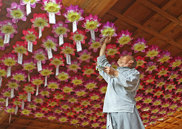 נזיר בודהיסטי מקשט את המקדש. העם הקוריאני גאה באלפי שנות היסטוריה, מסורת ושילוב מרתק של דתות, אמונות ופולחנים שונים | צילום: TamasV / Shutterstock.com