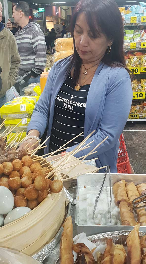 כדי להכניס אותנו לאווירה וכיאה לסיור קולינרי, היא מוזגת לנו לימונצ'לו שהכינה בעצמה ומכבדת בממתק פיליפיני מבטטה סגולה מהשוק הפיליפיני, ובה בעת מביאה את סיפור השכונה.