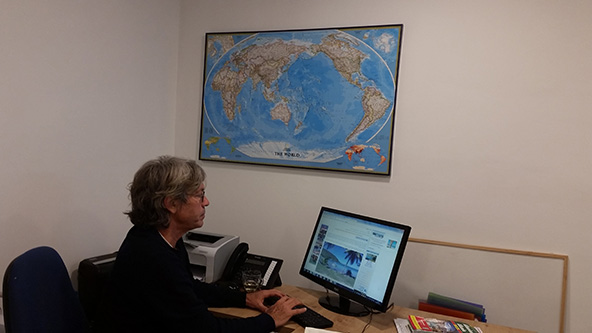 על הקיר מעל שולחני תלויה מפת עולם משונה שמושכת את תשומת לבו של המתבונן. משהו בה לא מסתדר עם המפה שכבר צרובה בראשינו. מבט בוחן יותר מגלה שהעולם בו הפוך. העולם הישן עם אפריקה אירופה ואסיה נמצא בצד השמאלי של המפה, ויבשת אמריקה בצד הימני של המפה. במרכז מפת העולם המשונה הזאת נמצא כתם כחול גדול שהוא האוקיינוס השקט. אותו אוקיינוס שבמפות הרגילות נדחק לשוליים מימין ומשמאל ומאבד שם את חשיבותו. במבט זום אין על האוקיינוס הכחול מפוזרות מאות נקודות זעירות בגודל ראש סיכה. אלו הם האיים הפולינזים. כל כך רחוקים, זנוחים ונידחים בקצה השני של העולם.