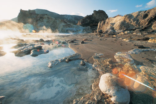 המזח מסתיים בכביש צר שמוביל אל צומת. חושך מצרים מסביב. אני נכנס למכונית שבאה איתי במעבורת, פונה ימינה ומתפתל במשך ארבעים דקות לאורך כביש צר ושבור דרך ארץ חשוכה, כמעט נטושה. פה ושם בתים מסביב, ברובם חשכה מוחלטת. שתי מכוניות חונות וחלון מואר באחד הבתים הם סימני החיים היחידים. בסוף הטיפוס נעלמים הבתים, והכביש מתחיל לרדת בזיגזג לאורך מדרון תלול. אורות המכונית לוכדים ארנבת מבוהלת. האיים, כפי שיתברר אחר כך, מלאים בארנבות מפוחדות ובציידים שרודפים אחריהן. בסיבוב האחרון לפני הים מנצנץ אור בודד בסוף הדרך. אני עוצר את המכונית על קו החוף. מזח קטן נמתח אנכית היישר אל הים. בקצהו קשורה סירת דיג קטנה, ובראש התורן שלה קבועה מנורה. הדייג על הספינה הוא בכלל מליפארי, ואין לו, כמובן, שום מושג על מלון. הוא מצביע על הבית החשוך לצד המזח ואומר שבקיץ זה פנסיון. אני מודה לו, מסתובב ומתחיל לנסוע בחזרה במעלה הכביש החשוך. בשלב הזה אני כבר מתחיל לחשוב ברצינות על כך שהלילה אשן מקופל בתוך האוטו, ועוד על בטן ריקה. בסוף אני מוצא את המלון היחיד שפתוח באי. קרוב לנמל, בין אדי הגופרית, מעל המכולת. במרתף הצמוד יש אפילו מסעדה פתוחה. עם יין ופסטה בכרסי העברתי את הלילה הראשון באי שהוא אבי אבות ההרים הוולקאניים כולם. חרוט מושלם של הר געש קרוב לחוף הפעילות התרמית בשיאה, והאיזור כולו מעשן. נביעות אחדות של מים חמים פורצות מתחת לפני המים לאורך קו החוף, ופני הים נראים רותחים. בשני מקומות נבנו חומות אבן קטנות סביב הנביעות, וכך נוצר ג'קוזי טבעי. שם אני מעביר את שארית הבוקר, עד שמתחמם מספיק כדי לטפס לפסגתו של וולקאנו.