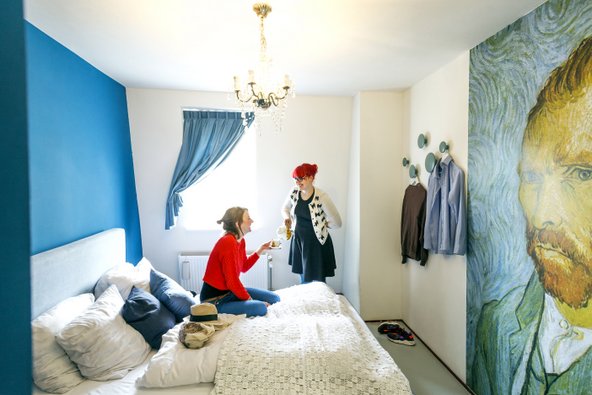 Cocomama, אמסטרדם בלב אמסטרדם, סמוך לשכונת דה פייפ הססגונית, לכיכר רמברנדט ולשוק אלברט קויפ, נמצא ההוסטל הצעיר והשמח הזה, בבניין עתיק ששימש בעבר כבית בושת. אל תתנו לעובדה האחרונה להרתיע אתכם – זהו הוסטל נעים, נקי, בטוח ובעיקר מעוצב להפליא ומלא אווירה. יש פה היצע גדול של חדרים, מחדרים פרטיים לזוגות ועד לאולמות שינה לשישה עם מיטות של שתיים ושלוש קומות, כאשר כל החדרים מלאי אופי, עם תקרות גבוהות שבהן משולבות קורות עץ ושנדלירים שמשתלשלים מן התקרה. כל החדרים מעוצבים סביב נושא מסוים הקשור בהולנד – מואן גוך וטוליפים ועד לאופניים וגבינות. יש כאן הרבה מאוד מקומות מפגש בהם אפשר להתרועע עם מטיילים אחרים – מערבי הקולנוע שמתקיימים באולם הקולנוע הקטן של ההוסטל, דרך המטבח הפתוח והמצויד היטב (שכמה פעמים בשבוע מתקיימות בו ארוחות משותפות למי שמתעצל לבשל) ועד לגינה היפה וללאונג' הנעים שבו יש מגוון של ספרים וסרטים. כתובת: Westeinde 18, אתר אינטרנט .jpg) חדר בהשראת ואן גוך ב-Cocomama .jpg) גם חדרי המעונות ב-Cocomama מצוחצחים ומעוצבים