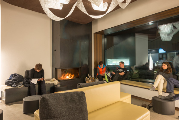WellnessHostel 4000, סאאס פה, שווייץ הוסטלים אמנם פופולריים מאוד בערים הגדולות, אבל גם בלב הטבע הולכים ונפתחים הוסטלים נהדרים. דוגמה מוצלחת להוסטל כזה היא WellnessHostel 4000 שבעיירת הסקי השוויצרית סאאס פה (Saas Fee). ההוסטל החדש בנוי במבנה עץ מודרני בן חמש קומות, על פי תקנים אקולוגיים, ושוכן במיקום עוצר נשימה על צלע הר עם נוף לקרחון וליערות מסביב. יש פה חדרים זוגיים ומשפחתיים עם שירותים ומקלחת פרטיים, לצד חדרים קבוצתיים עם שש מיטות ושירותים ומקלחות משותפים באותה קומה. כל החדרים נקיים, נעימים ומעוצבים בסגנון מינימליסטי. .jpg) לאונג' חמים ונעים, עם אח מבוערת, ב-WellnessHostel 4000