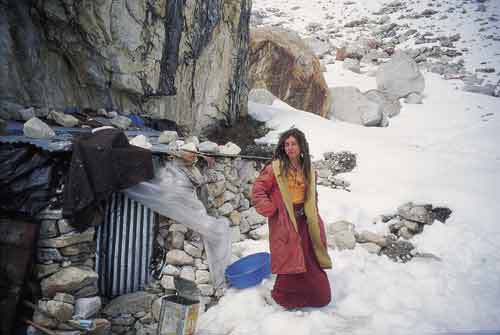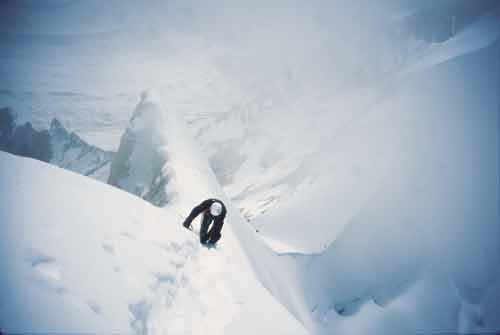"שיטת המשלחת", לעומתה, היא מגושמת ואטית, אבל יש לה יתרונות. סוחבים ציוד רב מאוד וכבד למחנות שנמצאים לאורך הדרך. לפעמים צריך לעלות ולרדת כמה פעמים כדי להביא עוד ציוד, כך שבכל מחנה יש תנאים טובים יחסית המאפשרים בעת הצורך המתנה סבלנית לתנאי טיפוס מתאימים. שיטה זו אומרת יותר זמן טיפוס, יותר זמן בתנאי חוסר חמצן ואולי גם פספוס חלון הזדמנות של מזג אוויר טוב. אנחנו לא מגיעים להחלטה. נראה מה יהיה. חילוקי דעות מתגלעים גם בנושאים טכניים אחרים. השפעות התנאים ניכרות בכולנו. אנו ישנים בצפיפות באוהל, בקור של עשרים מעלות מתחת לאפס, אוכלים מנות מהירות הכנה ומפשירים את השלג למי שתייה ובישול. הדיונים הופכים לוויכוחים קשים, ואני חש בנימה עוינת במיוחד כלפי מצדו של גיא. אני מבין שחייבים לפתוח את הדברים. מתברר שגיא מרגיש שאני לא מכבד את האופן שבו הוא מנתח את המסלול. אני רק חשבתי שכמה מהניתוחים שהציע מוקדמים מדי. למרות הקור, הרוחות מתלהטות. גיא מסרב לקבל את הסברי ולא רוצה להשלים. הלחץ והתנאים הקשים מעצימים את הרגשות. התחושה אצל כולם קשה. מבטים זועמים, עצובים, גם מבולבלים: לא ברור אם יהיה בכלל המשך למסע המשותף. בגובה 5,000 מטר יש באוויר רק מחצית מכמות החמצן שיש באוויר בגובה פני הים. זה לא עוזר להירגע. אנו ממשיכים בלי להחליט. גיא ומורן חסרי מנוחה, יוצאים לבדם בסופת שלג קלה ומטפסים קטע סלע תלול. הם מעלים תיק עם אוכל למחנה הבא, מחברים חבל בסוף הקטע הקשה וגולשים בחזרה לאוהל. למחרת אנו עולים את הקטע עם התיקים הכבדים על הגב ומאובטחים לחבל. הגוף מכוסה היטב מהקור. הטיפוס מתבצע תוך כדי שימוש בידיים מכוסות בכפפות טובות בשילוב גרזני קרח וקרמפונים – תופסנים בעלי שיניים חדות הנתקעות ונאחזות בקרח. הקרמפונים מורכבים על נעלי טיפוס מיוחדות, המבודדות מהקור העז.