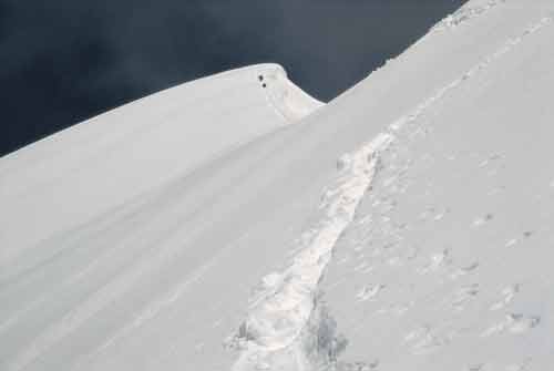 סכנת הקור גבוהה בעיקר כשמטפסים בצוות של ארבעה, כי בדרך כלל חלק מהצוות מחכה ללא תנועה ומאבטח את המטפס המוביל באותו הרגע. הסופה מתחילה בדרך כלל מאוחר יחסית, ואני מעדיף להיכנס לתחילתה בסוף יום טיפוס, כשהגוף חם, מאשר לצאת בלילה בקור נורא. בקור כזה התפקוד נפגע, ואיברי הגוף קופאים עד כדי סכנת נמק. בשש בבוקר, במחנה בגובה 5,350 מטר, אני נשאר באוהל, בעוד שהשלושה יוצאים לטפס ולהכין חבלים לחלק מהטיפוס מחר. אני שלם עם עצמי, מתעורר לאטי ליום יפה ובהיר, השמש מחממת את גופי ואני מפשיר את הביגוד והציוד הקפוא של כל הצוות. ב־00:12 אני מחליט לעלות ולראות לאן אגיע. התנאים נוחים ומאפשרים לי קצב מהיר. אני נעזר בחבלים שהם הכינו, ובתוך שעתיים וקצת אני מצמצם את הפער ומדביק אותם. שביב תקווה בדרך לפסגה למחרת רן ומורן מובילים יום ארוך, מכינים לנו תשתית של חבלים אך משאירים לכל אחד מאיתנו ציוד כבד, כעשרים קילוגרם, לסחוב על הגב בטיפוס תלול. גיא ואני יוצאים מאוחר במזג אוויר לא רע. אני מוביל ברוב הדרך, וגיא בעקבותי. אנו מטפסים במהירות דרך מצוקים תלולים וקטעי שלג וקרח. ביום שכזה מרגישים את החשיבות שבאימונים. אנחנו מוכנים ומתואמים, ובזכות קצב מהיר וריכוז אנו מגיעים למחנה הפסגה, בגובה 5,950 מטר, מיד עם פרוץ הסערה של אחר הצהריים. מורן ורן נאבקים ברוח החזקה ומקימים את האוהל. גיא נשאר רכון על השלג כמה מטרים מאחור. ברוח החזקה הוא לא שומע דבר, ואני ניגש לבדוק מה קרה. צרכים של הטבע. אני נושם לרווחה וצוחק, הכל בסדר. בלילה הטמפרטורות צונחות ל־35 מעלות מתחת לאפס ומקפיאות כל דבר, כולל את