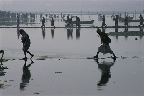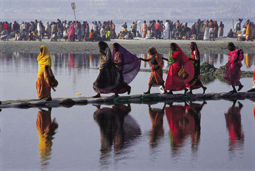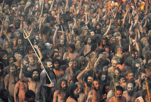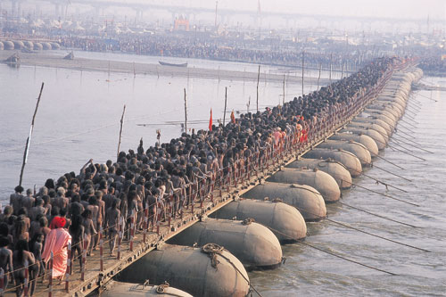 | עולי רגל חוצים קטע של נהר הגנגס על שביל של שקי חול, בדרכם חזרה לעיר האוהלים לאחר טבילה. כדי למנוע התנפלות המונית על איזור הטבילה המרכזי, ניסו המארגנים-בהצלחה, יש לומר-לשכנע חלק מעולי הרגל …. |  | נזירי סאדהו נאגה העירומים, בדרכם חזרה מן הטבילה המקודשת ב-14 בינואר. אלה הם הקיצוניים והמחמירים ביותר מכל הסאדהואים, ועולי הרגל חלקו להם כבוד רב: קדו להם קידות, לעיתים נישקו את הארץ שעליה… |  | בארץ שבה המגע אסור כמעט וכתף חשופה היא סמל לפריצות מינית, פשטו עולי הרגל את בגדיהםללא עכבות לפני הטבילה בנהר. עירום ללא שמץ של מיניות, לפחות לא נראת לעין ערום מלא הוא חובה אצל כמה… |