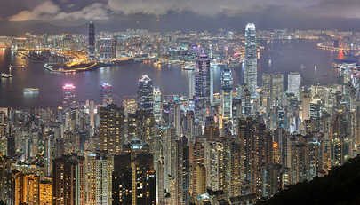 המראה הנשקף מפסגת ויקטוריה בלילה: קו הרקיע המואר של אזור הסנטרל באי הונג קונג ומעבר למפרץ – גורדי השחקים של קאולון | צילום: Base64, GFDL