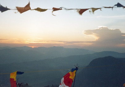 דגלי תפילה מתנופפים בזריחה על פסגת אדם. תחושה של שקט פנימי