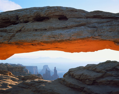 קניונלנדס. הזריחה צובעת בכתום את קשת מסה, שדרכה נשקף נוף מרהיב