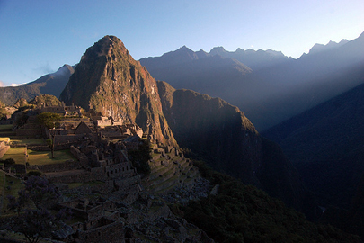 קרניים ראשונות מאירות את מאצ'ו פיצ'ו ואת פסגת ההר התלול