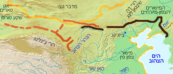 החומה הגדולה שהוקמה בתקופת שושלת האן: בצהוב – גבולות סין כיום; בשחור – חומה שנבנתה בתקופה הראשונה לשושלת האן במאה ה-2 לפנה"ס; בכתום – חומה שנבנתה במאה ה-1 לספירה | Ksyrie, wikipedia