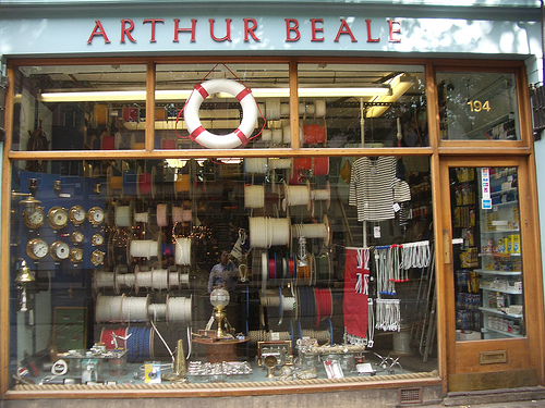 חנות נוספת, שהמיקום שלה מעט מפתיע בהתחשב בעבודה שהים רחוק מכאן, היא Arthur Beale, שמתמחה בציוד ימי ומוצרי ספנות. תוכלו לקנות כאן חבלים, מצופים, פעמונים, חולצות ספנים, ברומטרים וכל מה שדרוש כדי לצאת להפלגה. גם החנות הזו כמעט לא השתנתה מאז נפתחה במאה ה-19. זהו גן עדן לימאים ולבעלי יאכטות, שימצאו כאן כל מה שהם צריכים ביחד עם ייעוץ מקצועי, אבל גם מי שמעולם לא עלה על ספינה ימצא כאן מזכרות ומתנות משעשעות. Arthur Beale |